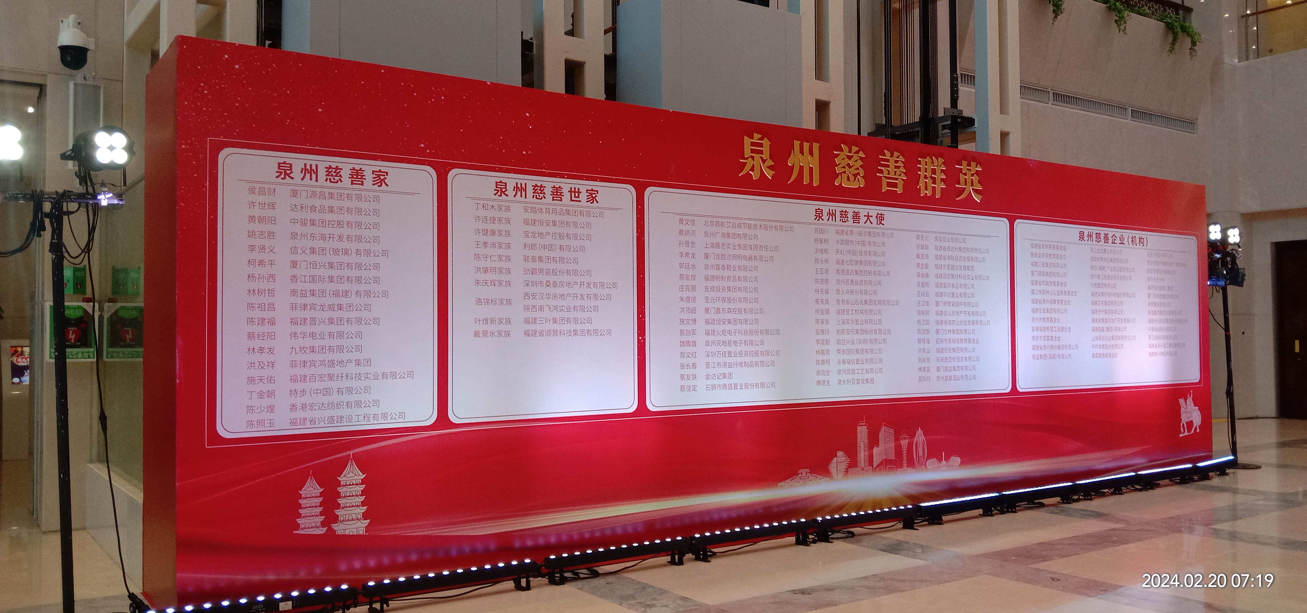 為大力弘揚(yáng)中華民族守望相助、樂善好施的傳統(tǒng)美德,宣傳、集中展示泉州市公益慈善事業(yè)惠民生、暖民心的積極貢獻(xiàn),厚植泉州公益慈善的社會(huì)基礎(chǔ),營造“泉民參與慈善 共創(chuàng)美好生活”的良好社會(huì)氛圍,2024年2月20日,泉州市召開慈善大會(huì),侯昌財(cái)、許世輝等17位被授予“泉州慈善家”稱號(hào);聯(lián)泰集團(tuán)陳守仁家族、安踏集團(tuán)丁和木家族、恒安集團(tuán)許連捷家族等等10個(gè)被授予“泉州慈善世家”稱號(hào);火炬電子蔡勁軍、展志實(shí)業(yè)孫晉忠、盼盼食品蔡金垵等48位被授予“泉州慈善大使”稱號(hào);泉州大開元寺、香港嘉鴻集團(tuán)發(fā)展有限公司等39家企業(yè)被授予“泉州慈善企業(yè)(機(jī)構(gòu))”稱號(hào)。