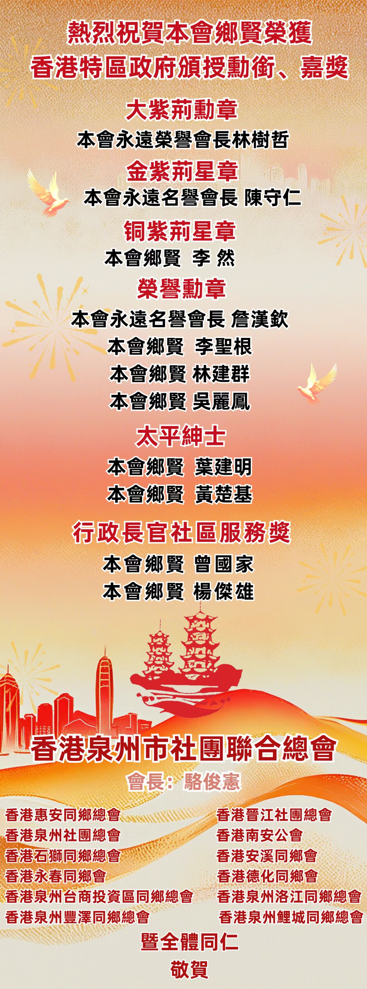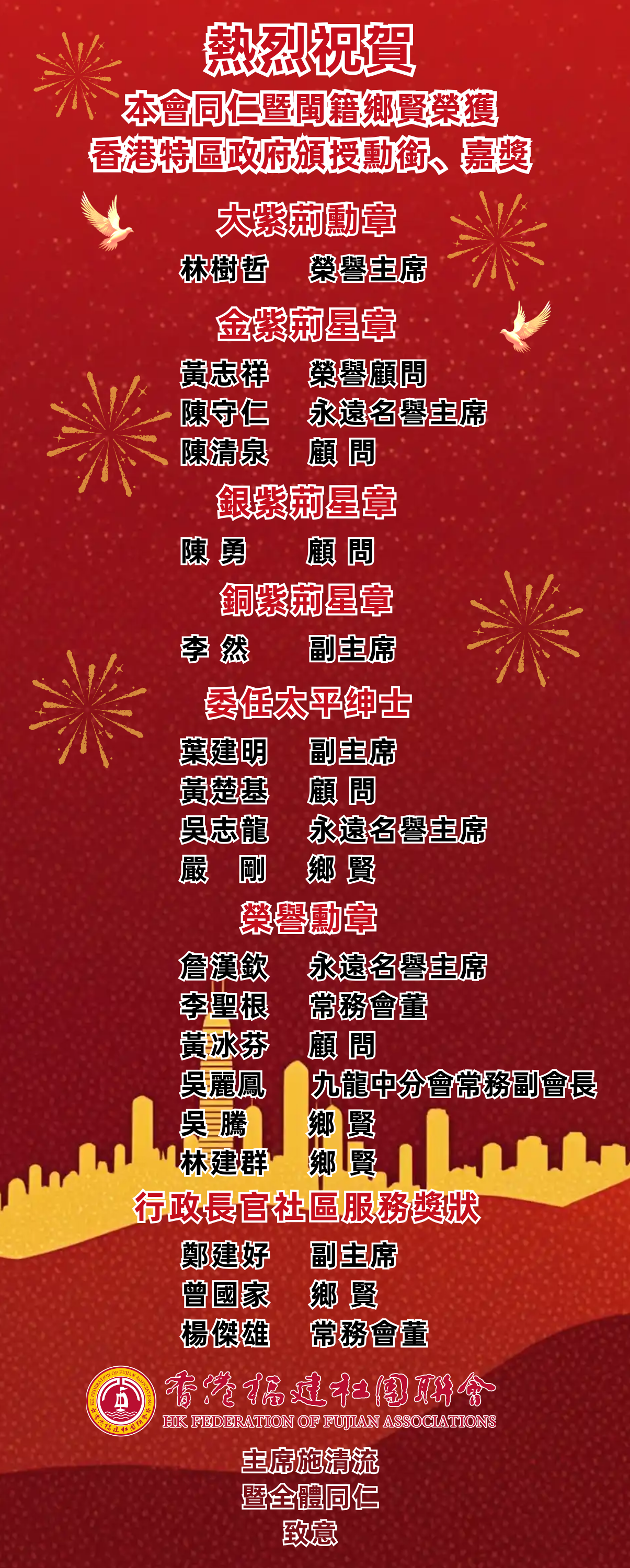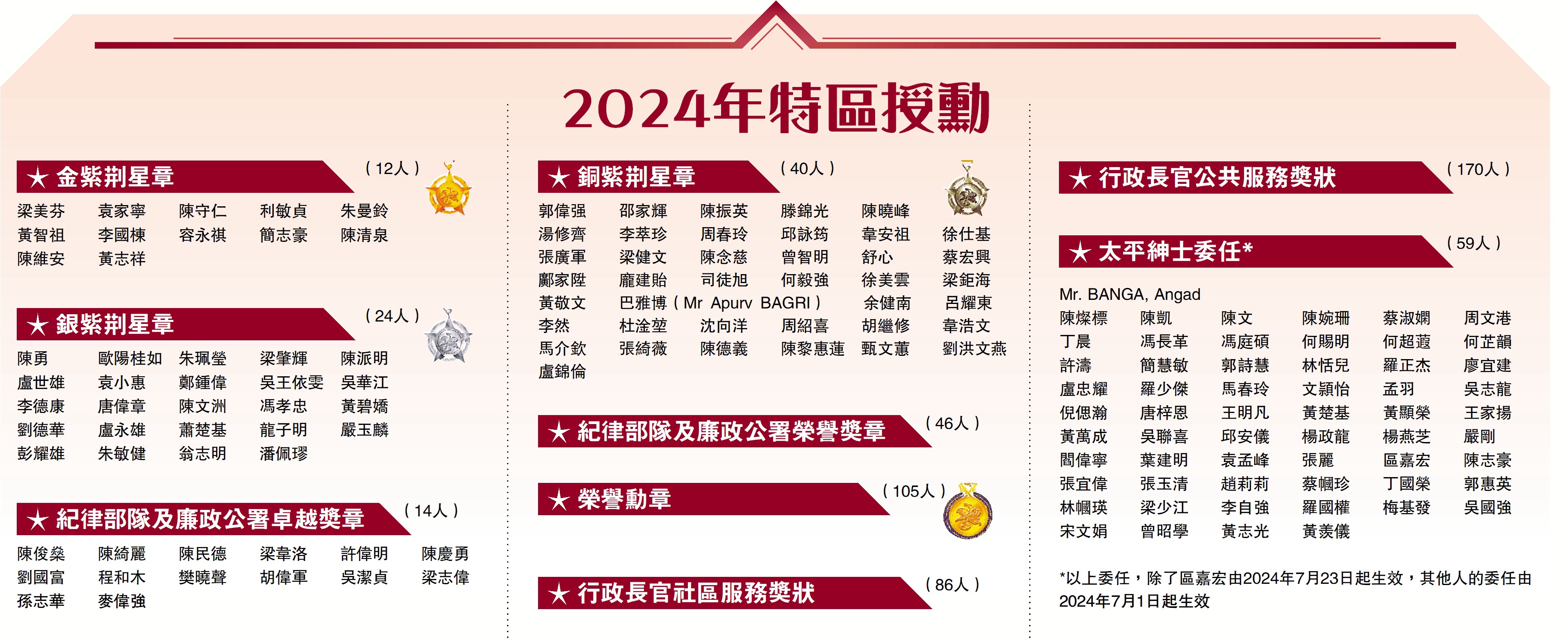 2024年7月1日,在香港回歸祖國27周年之際,香港特別行政區(qū)政府在憲報刊登2024年授勛及委任太平紳士名單,共502人獲行政長官頒授勛銜及作出嘉獎。