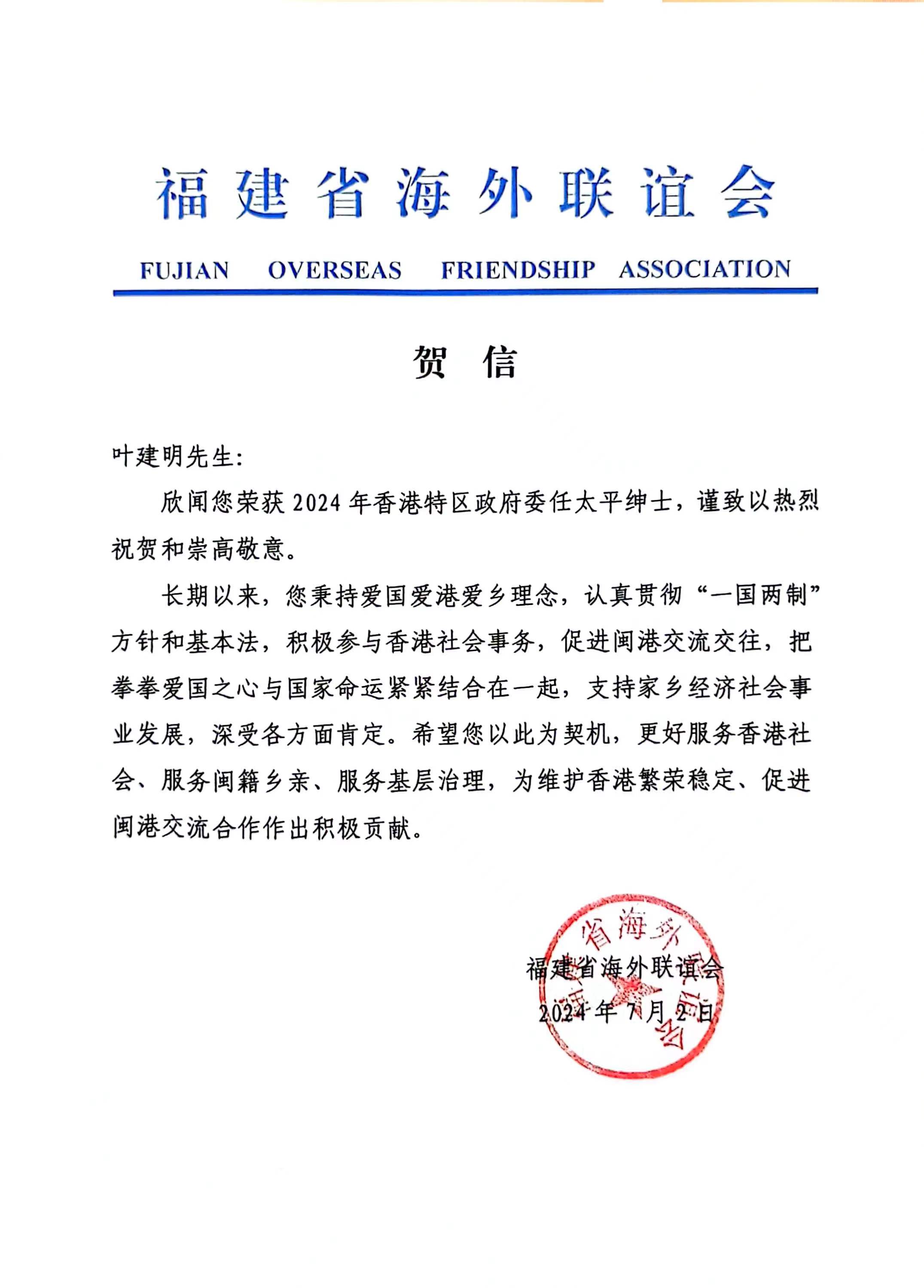 葉建明先生,十三屆、十四屆全國政協(xié)委員,香港福建社團聯(lián)會副主席、香港樂群慈善基金會常務副主席、香港福建希望工程基金會榮譽主席、香港福建同鄉(xiāng)會副會長、香港島各界聯(lián)合會第十屆常務副理事長及第四屆常務董事、香港泉州同鄉(xiāng)會會長、香港手套業(yè)商會有限公司名譽會長、福建省省慈善總會特約顧問、鯉城區(qū)工商聯(lián)(總商會)永遠榮譽會長等職務,2022年香港“榮譽勛章”獲得者,嘉鴻集團在2024年也被泉州市人民政府授予“泉州慈善企業(yè)(機構(gòu))”稱號。