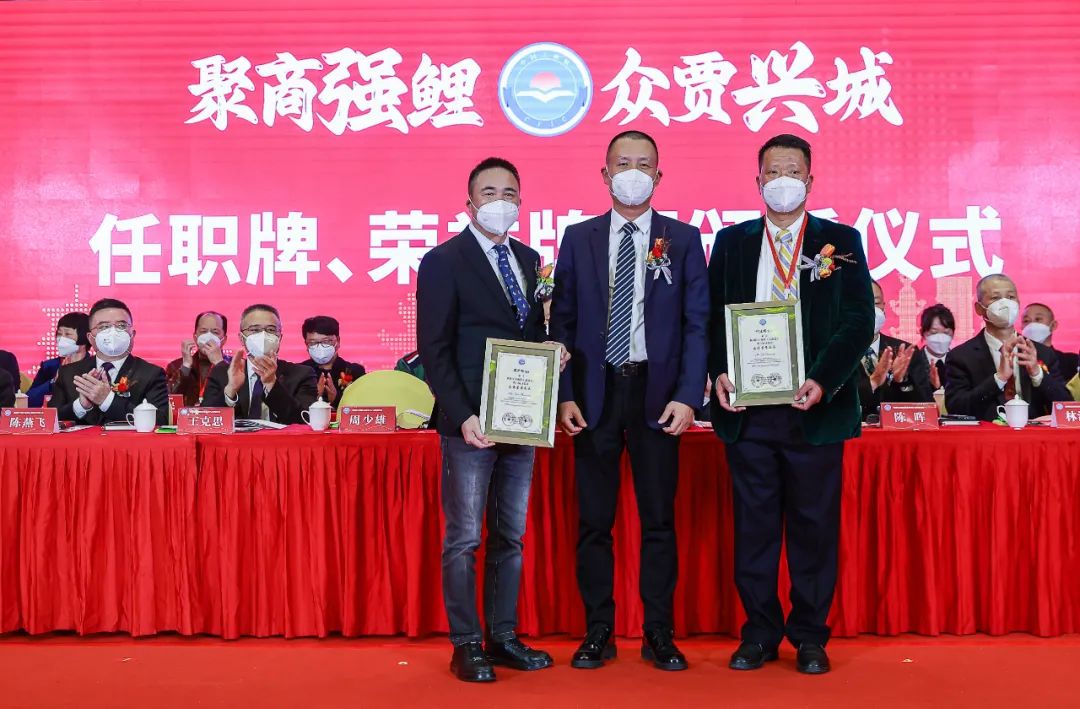 林建培為永遠(yuǎn)榮譽(yù)會(huì)長(zhǎng)葉建明、周少雄呈送聘書