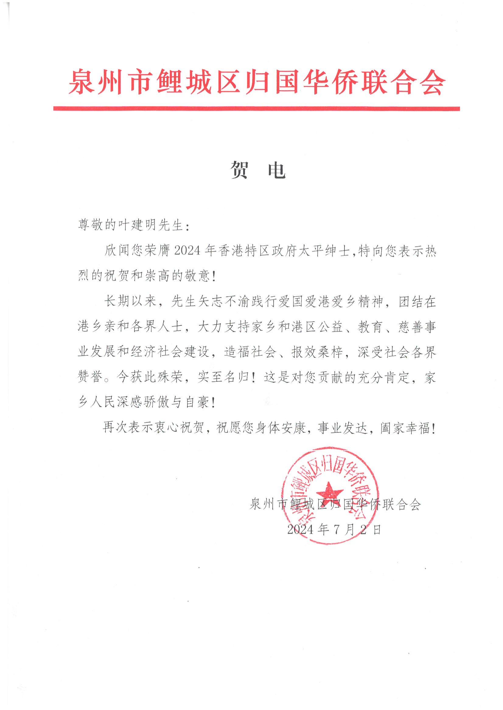 泉州市鯉城區(qū)歸國華僑聯(lián)合會賀電 福建省海外聯(lián)誼會賀信