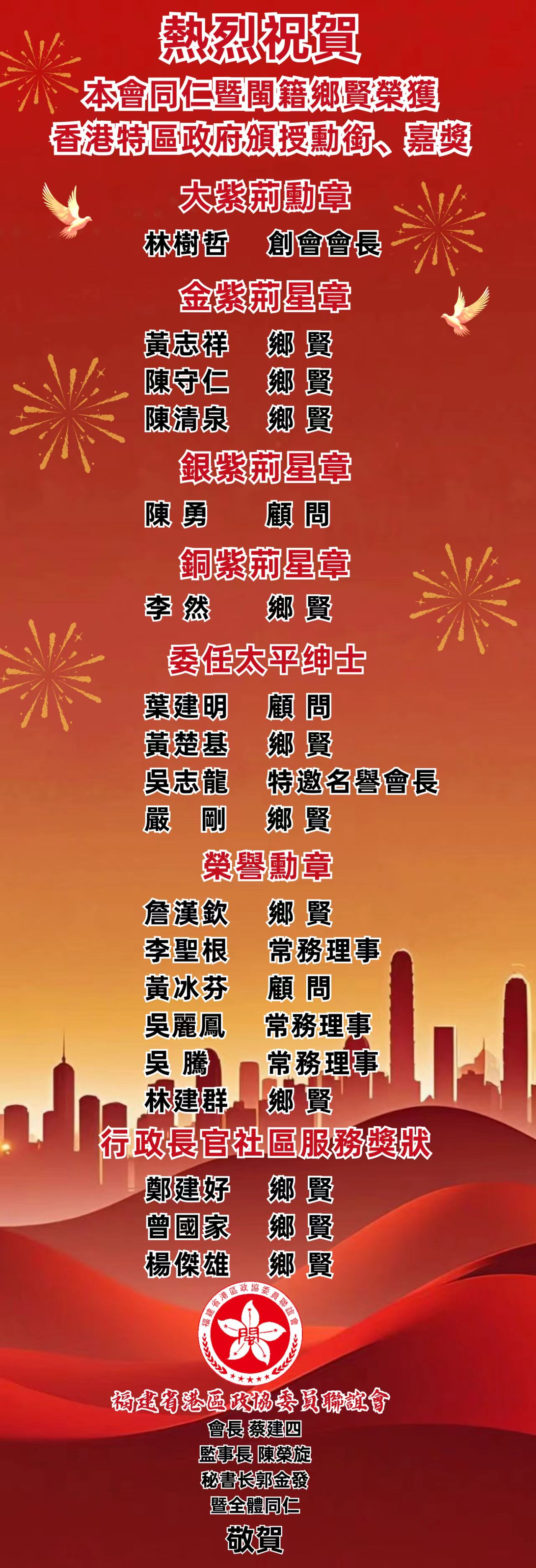 2024年7月1日,在香港回歸祖國27周年之際,香港特別行政區(qū)政府在憲報刊登2024年授勛及委任太平紳士名單,共502人獲行政長官頒授勛銜及作出嘉獎。