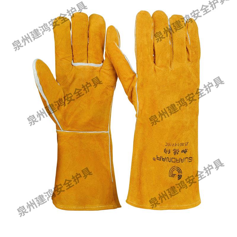 隔熱焊工防護(hù)手套,梔形拇指,牛皮加強(qiáng)掌面,加長(zhǎng)袖口長(zhǎng)14cm,可有效防護(hù)機(jī)械風(fēng)險(xiǎn),防火防燃、抗傳導(dǎo)熱與接觸熱,同時(shí)可防止小滴熔化金屬濺射。